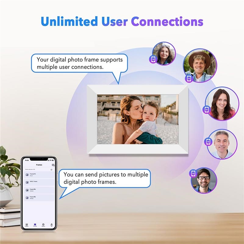 Mit der dazugehörigen mobilen App können Sie von überall aus sofort Fotos oder Videos an den Rahmen senden. Dank der Unterstützung für die Synchronisierung mit mehreren Geräten können mehrere Familienmitglieder Momente direkt an den Rahmen senden.