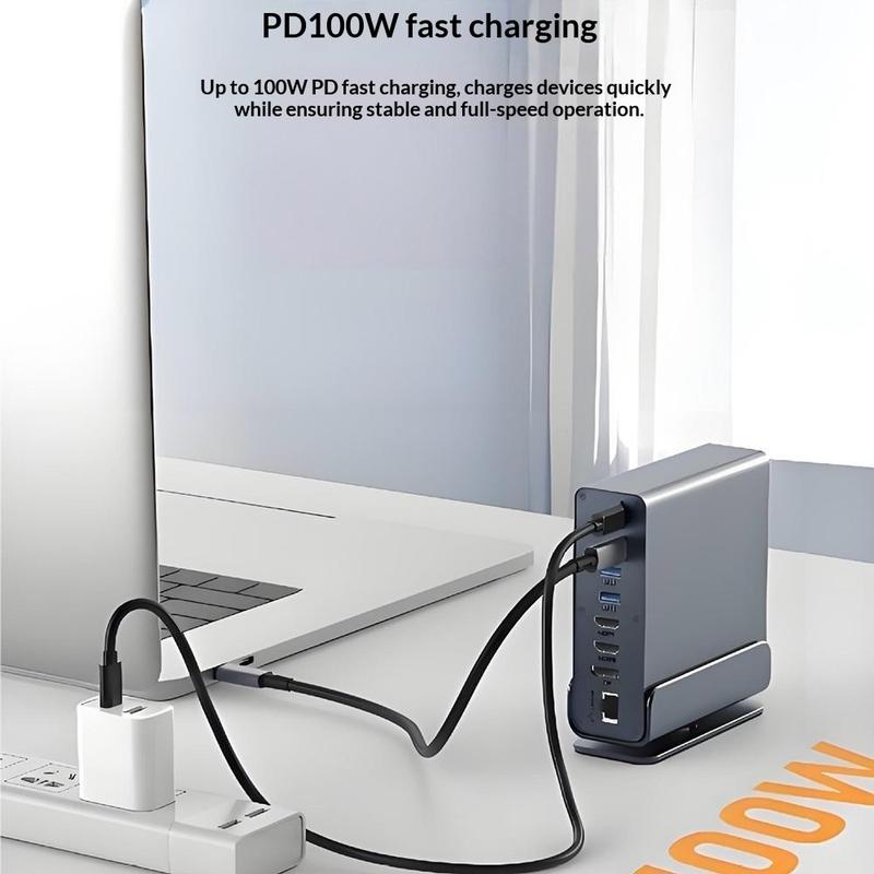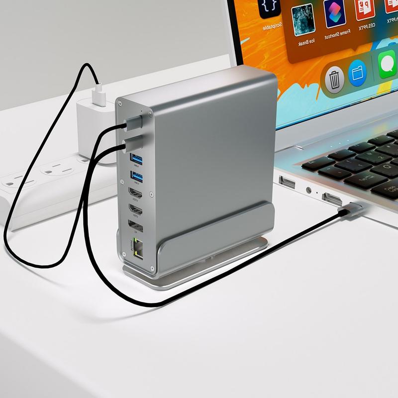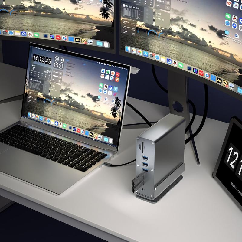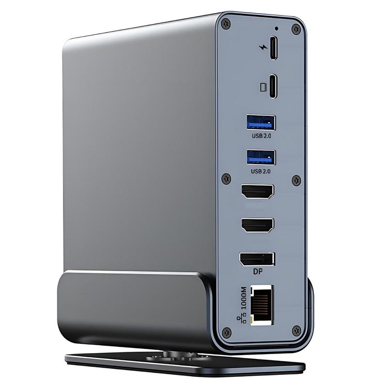 Wenn Sie es leid sind, mit Adaptern zu jonglieren, vereinfacht dieses Dock alles: mehr Displays, schnellere Anschlüsse, kabelgebundenes Internet, Kartenzugang und Aufladen über einen kompakten Hub. Der integrierte Ständer und das Metallgehäuse sorgen für ein echtes Desktop-Upgrade - kein billiger Dongle -, während USB 3.2- und 4K@60Hz-Ausgänge die Leistung für moderne Workflows bereit halten.