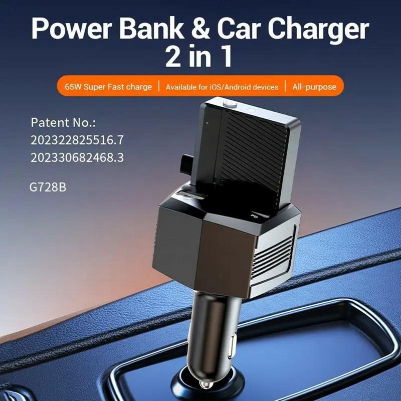 2-in-1 65W Schnelles Autoladegerät mit USB-C PD, USB-A Anschlüssen und 2000mAh USB-C Power Bank mit Taschenlampe