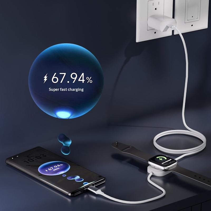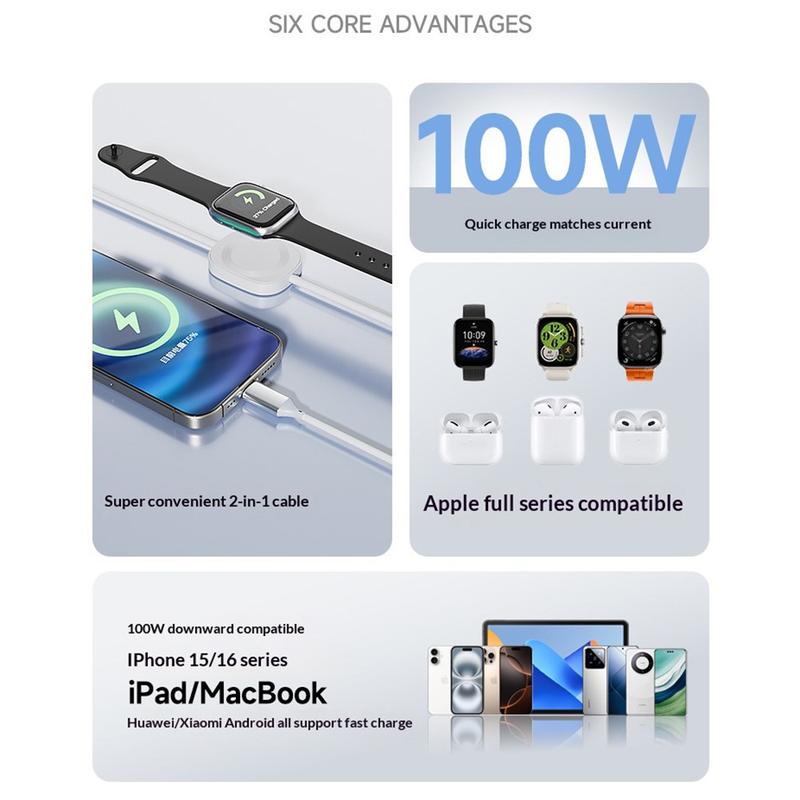 Dieses 2-in-1-Schnellladekabel macht Schluss mit dem Kabelsalat, indem es einen leistungsstarken 100-W-PD-Anschluss mit einem magnetischen Apple Watch-Ladegerät kombiniert. Der starke Magnet sorgt für eine perfekte, sorgenfreie Ausrichtung, während der Kupferkern die Effizienz erhöht und die Gerätebatterien während des Schnellladens schützt. Durch die breite Protokollkompatibilität ist es ideal für Benutzer mit mehreren Geräten und bietet Geschwindigkeit, Komfort und langfristige Zuverlässigkeit in einem kompakten Zubehörteil.