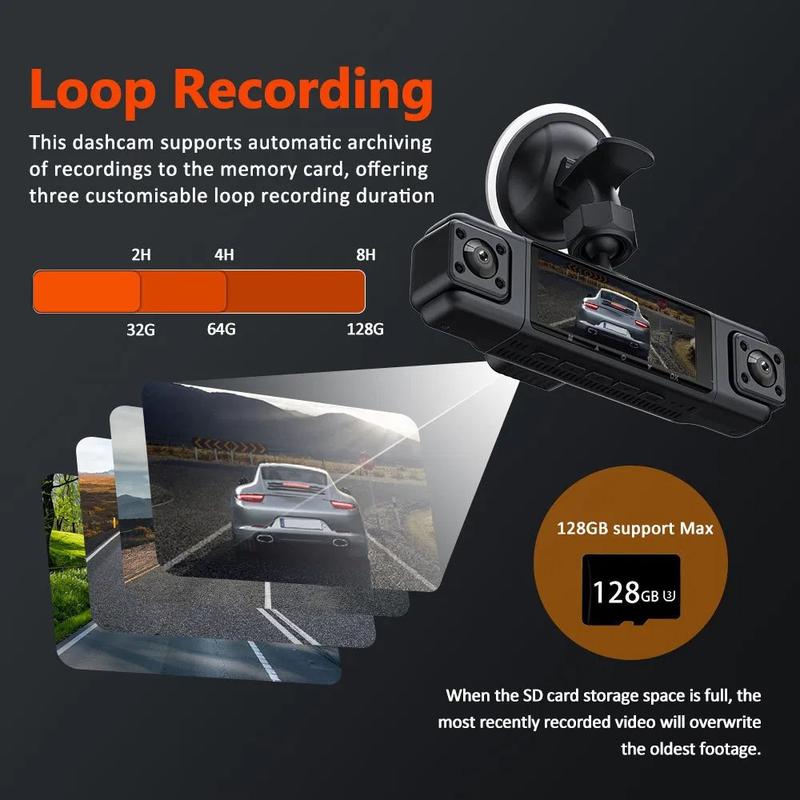 Mit dieser Dashcam mit 3.0-Zoll-IPS-Bildschirm und 4 Objektiven, die Ihre Fahrt in außergewöhnlicher Klarheit aufzeichnet, sind Sie auf der Straße sicher und umfassend geschützt. Mit einer 1080P-Frontkamera und drei zusätzlichen 480P-Seiten- und Rückobjektiven bietet sie eine vollständige Rundumabdeckung für ein sichereres und selbstbewussteres Fahrerlebnis.
