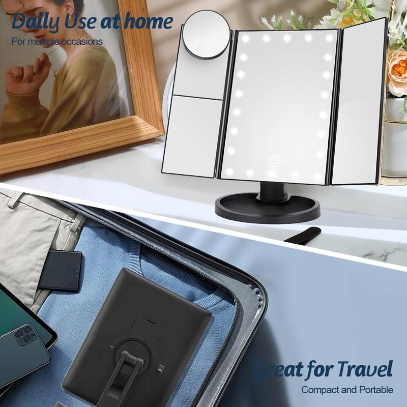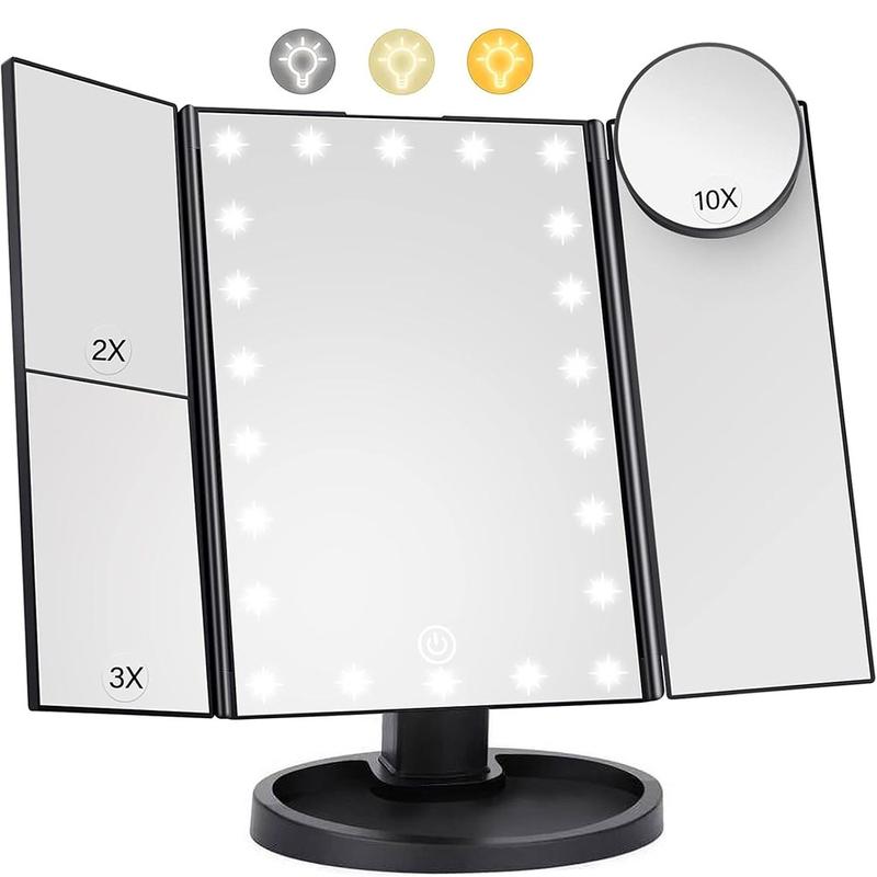 3-seitig klappbarer Schminkspiegel mit 22 LED-Leuchten - 1X/2X/3X/10X Vergrößerungsspiegel für den Kosmetikspiegel