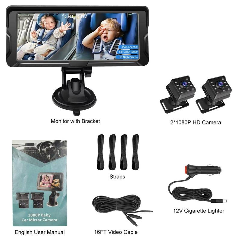 6,8-Zoll Auto-Baby-Monitor - Dual 1080P HD-Kameras mit 360-Grad-Drehung, Weitwinkelansicht und Infrarot-Nachtsicht