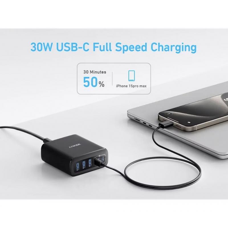 Herkömmliche Multi-Port-Adapter drosseln oft, wenn sie voll geladen sind. Ankers PowerIQ-Algorithmus hält 30 W an USB-C1 aufrecht, selbst wenn alle Steckdosen belegt sind, und stellt sicher, dass wichtige Geräte mit der erwarteten Geschwindigkeit geladen werden. Das vertikale Format schafft Platz auf dem Schreibtisch, und der mitgelieferte Silikon-Organisator hält überschüssige Kabellängen unter Kontrolle.