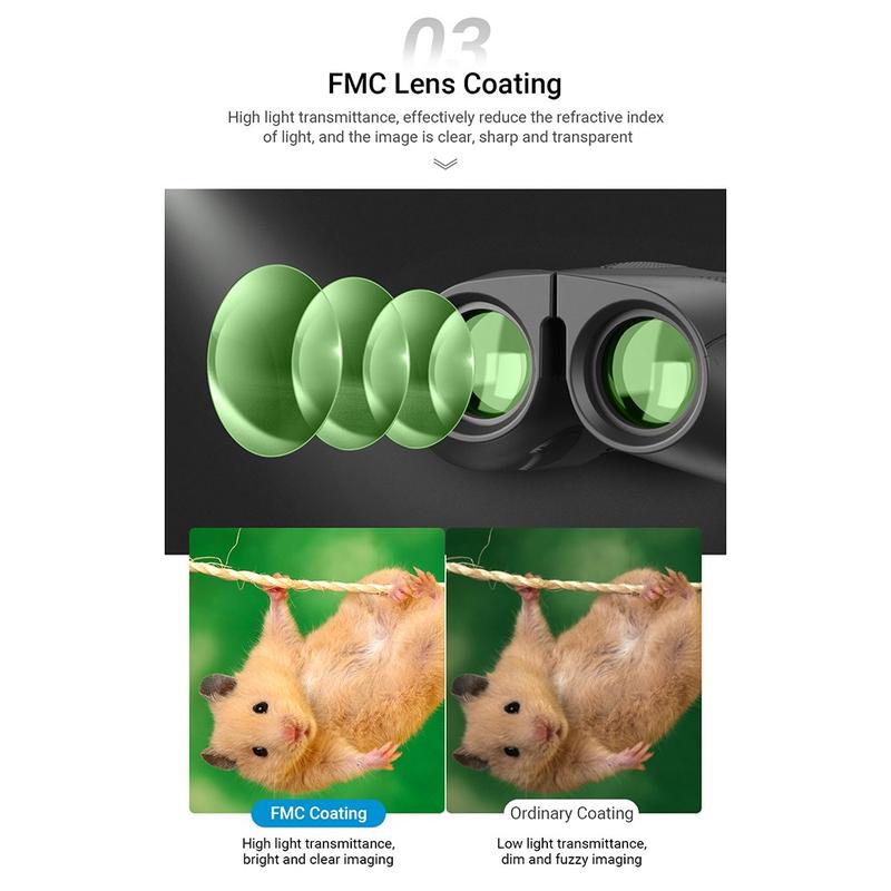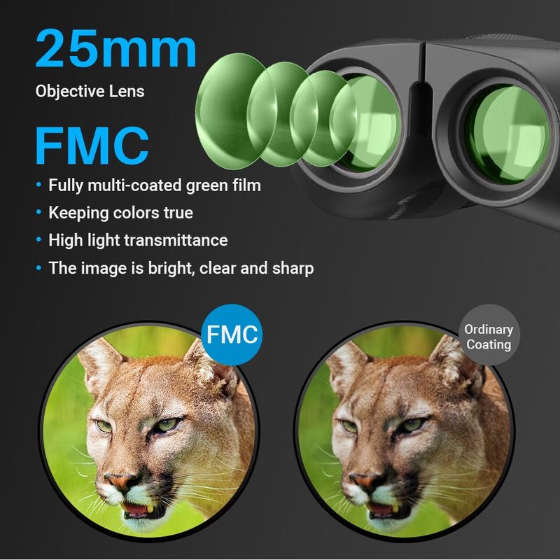 Ausgestattet mit BAK4-Prismen und FMC (Fully Multi-Coated)-Linsen liefern diese Ferngläser helle, scharfe und kontrastreiche Bilder mit ausgezeichneter Farbtreue. Das 16-mm-Okular und die 25-mm-Objektivlinse sorgen für ein weites Sichtfeld von 112 m/1000 m (6,2°) und bieten ein komfortables, stabiles Seherlebnis mit minimaler Verzerrung und ohne Schwindelgefühl.