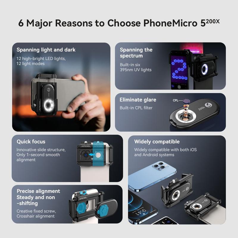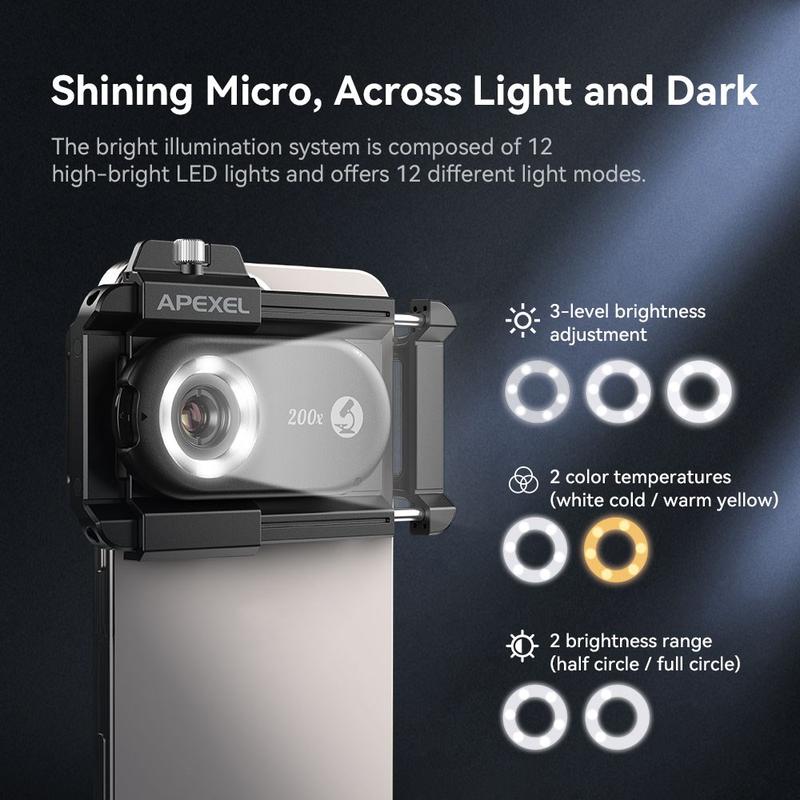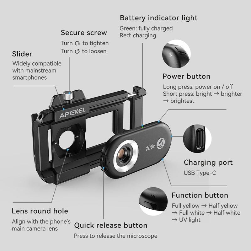 Erforschen Sie die mikroskopische Welt mit dem Apexel APL-MS100 Smartphone-Mikroskop, das eine hochauflösende Vergrößerung, vielseitige Beleuchtung und ein benutzerfreundliches Design bietet. Perfekt für Bastler, Studenten und Profis: Verwandeln Sie Ihr Smartphone in ein leistungsstarkes Beobachtungswerkzeug und entdecken Sie die unsichtbaren Details alltäglicher Objekte.