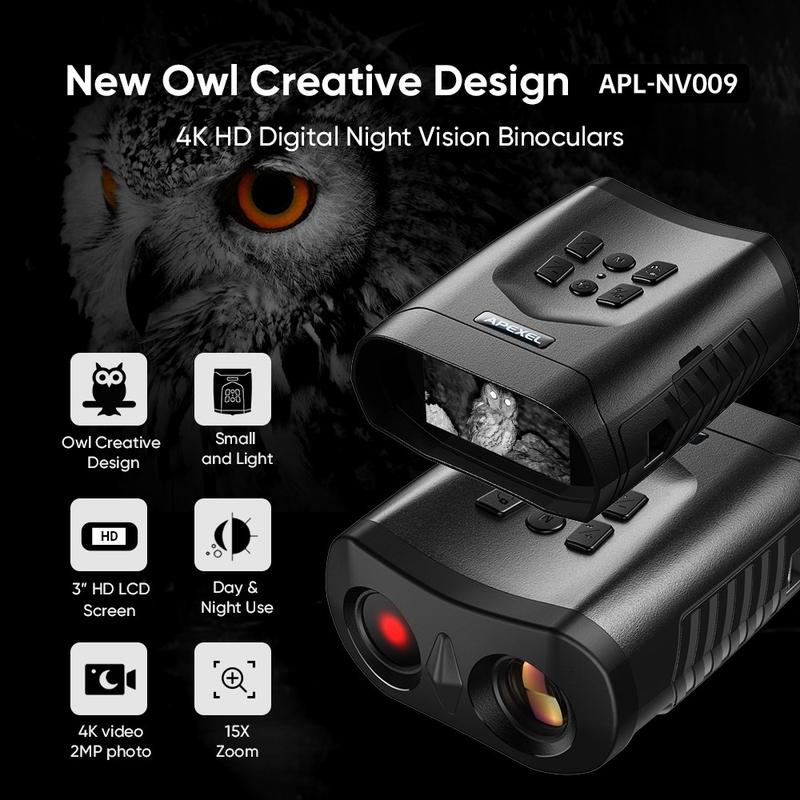 Erleben Sie unvergleichliche Klarheit bei schlechten Lichtverhältnissen mit dem APEXEL APL-NV009 Digital Night Vision Binocular. Mit der Kombination aus optischem 5fach-Zoom, digitalem 3fach-Zoom und einem hochauflösenden 3-Zoll-IPS-Display ist dieses tragbare Gerät perfekt für die Aufnahme von atemberaubenden 4K-Videos und detaillierten 2-12MP-Fotos bei Tag und Nacht. Sein ergonomisches, von einer Eule inspiriertes Design und die integrierte Infrarotbeleuchtung machen es zu einem Muss für die Erkundung von Außenbereichen, die Beobachtung von Wildtieren und die Sicherheitsüberwachung.