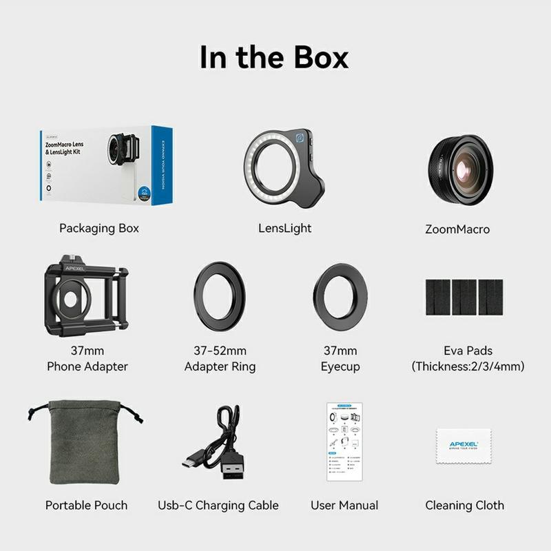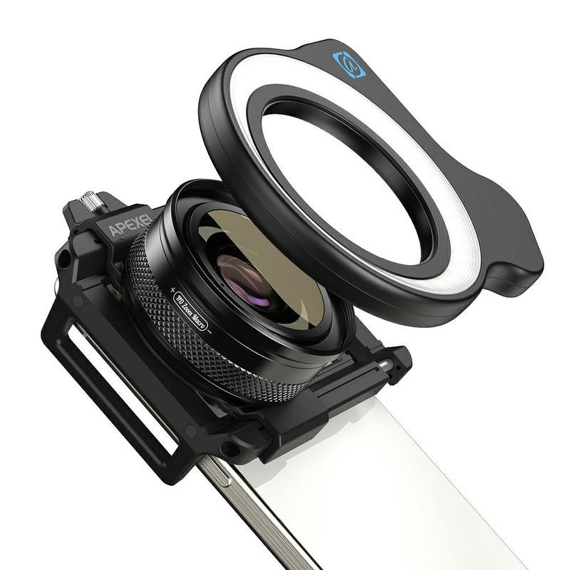 Apexel APL-ZM100FL26 Professionelles Zoom-Makro-Objektiv mit 9-fachem Ringlicht - 52mm/37mm Gewinde