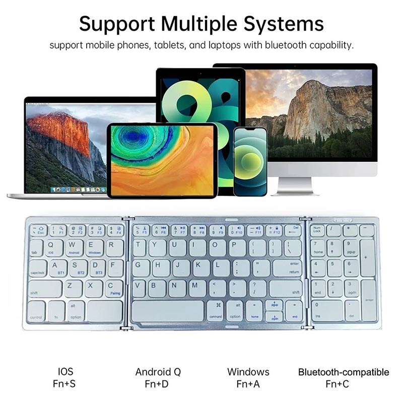 Das clevere dreifach faltbare Design erleichtert den Transport in einer Tasche, einem Rucksack oder einer Laptoptasche, während der Magnetverschluss dafür sorgt, dass sie während des Transports sicher zusammengeklappt bleibt. Dank der Unterstützung von bis zu drei Bluetooth-Geräten können Sie mithilfe der speziellen Tasten BT1, BT2 und BT3 nahtlos zwischen Ihrem Smartphone, Tablet und Laptop wechseln. Dies macht die Tastatur besonders nützlich für Multitasking über verschiedene Geräte und Betriebssysteme hinweg.