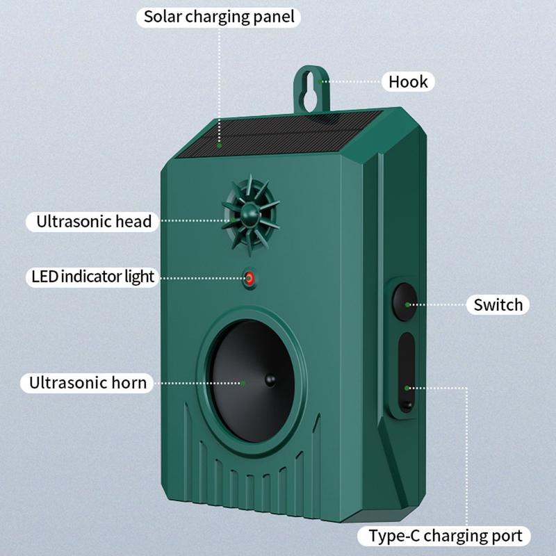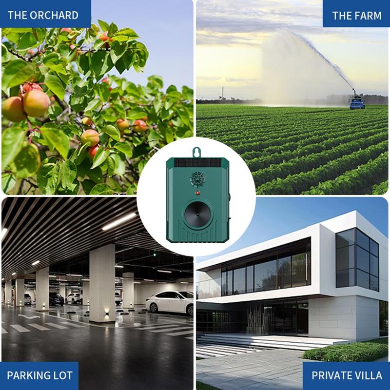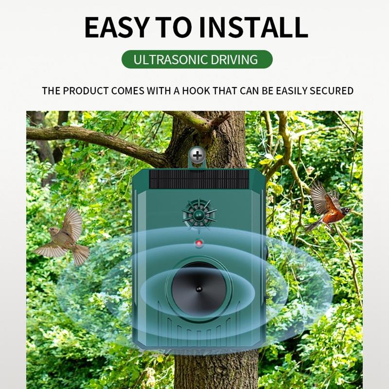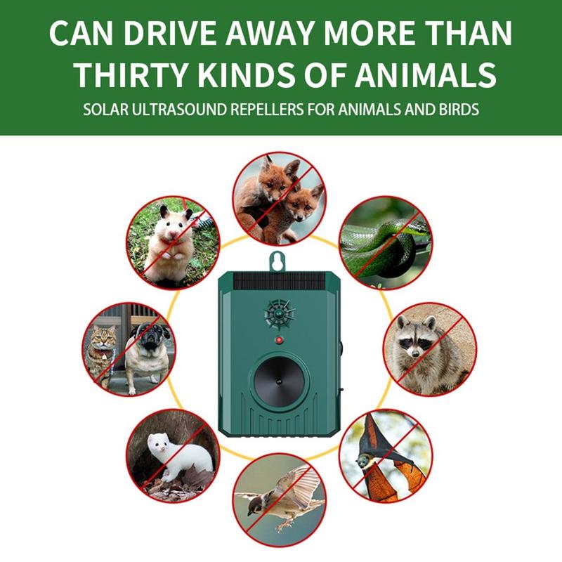 Durch die Kombination von Ultraschallwellen (8-35 KHz) und akustischen Signalen schreckt das Gerät Vögel, Nagetiere, Fledermäuse, Hunde, Eichhörnchen und andere Wildtiere wirksam ab. Das Design mit doppelter Wirkung erhöht die Erfolgsquote bei der Abwehr einer größeren Anzahl von Schädlingen.