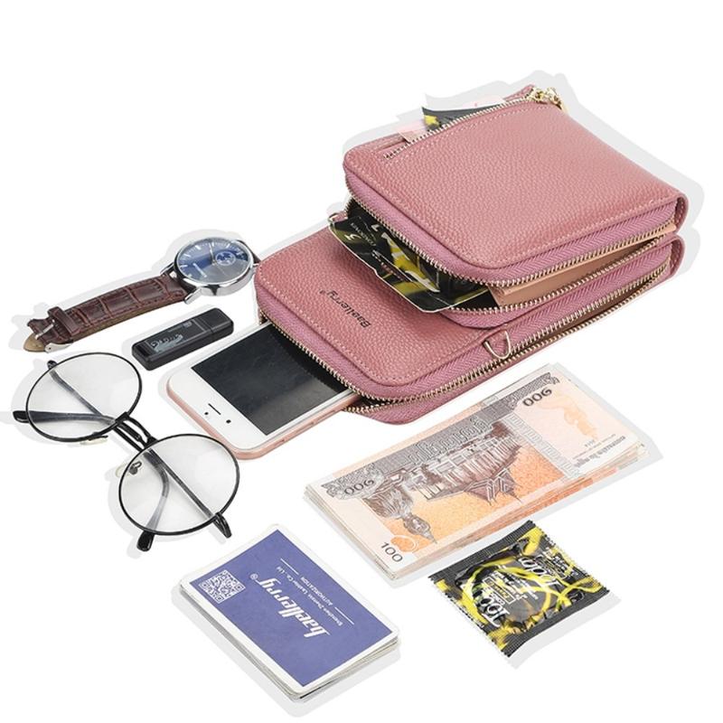 The roomy interior can hold your cellphone, cards, cash, coins, keys, etc.
