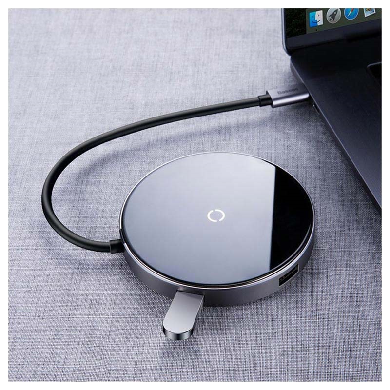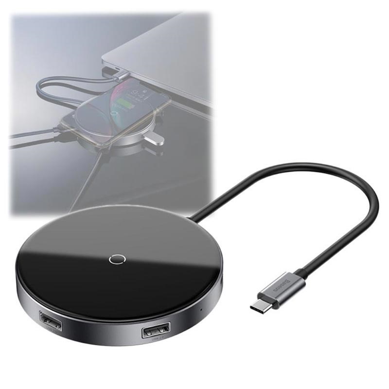 • Baseus Circular Mirror 6-in-1 Qi Ladegerät und Hub mit Typ-C PD, 4 USB Ports - 10W, 60W, 5Gbps, 480Mbps