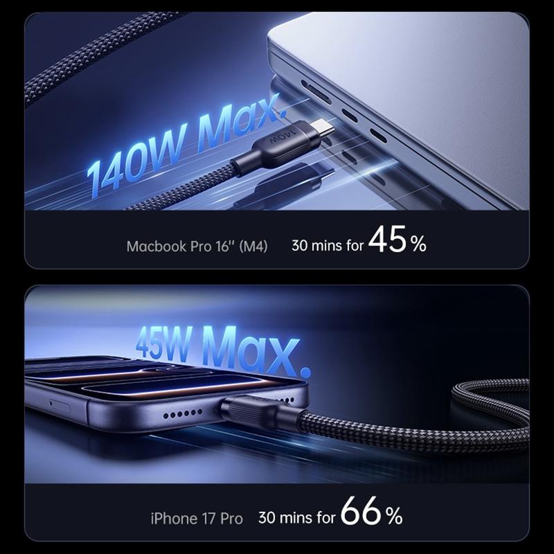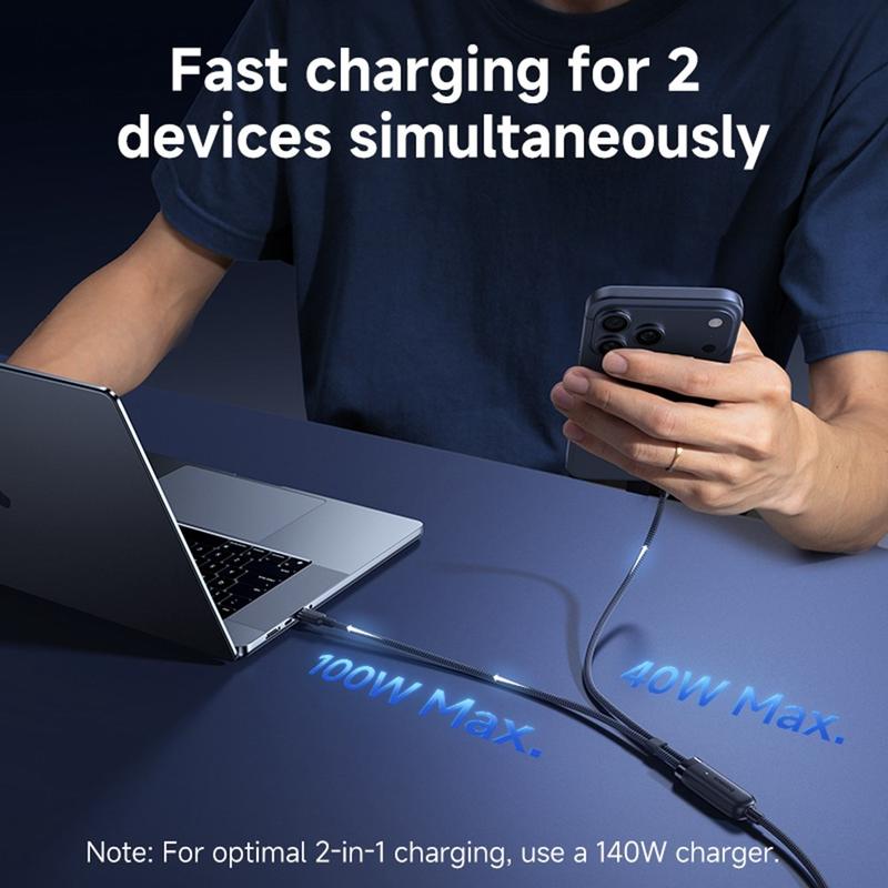Laden Sie zwei Geräte über ein einziges Kabel mit dem BASEUS Flash 4 2-in-1-Schnellladekabel. Dieses intelligente Ladekabel wurde für moderne USB-C-Geräte entwickelt und vereint hohe Ausgangsleistung, breite Kompatibilität und praktisches Kabelmanagement in einer reisefreundlichen Lösung. Es unterstützt bis zu 140 W für das Laden eines einzelnen Geräts und kann die Leistung gleichzeitig intelligent auf zwei Geräte aufteilen, wodurch es sich ideal für Laptops, Tablets, Smartphones, Handheld-Konsolen und mehr eignet.
