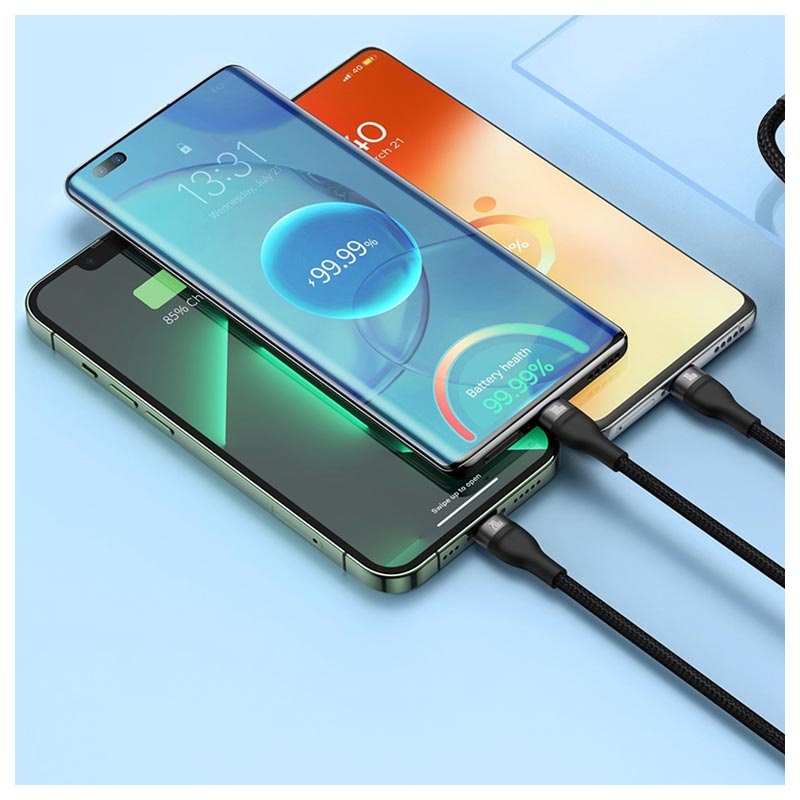 Schnelles Aufladen von bis zu drei Geräten gleichzeitig (Lightning, Type-C, microUSB) dank des Baseus Flash Series II Qualitäts-Geflechtkabels. Verschiedene Anschlüsse ermöglichen den breiten Ladebereich von Smartphones, Tablets und Laptops und verteilen die Leistung je nach Bedarf. Überprüfen Sie den Schnellladestatus über eine LED-Anzeige und machen Sie sich keine Sorgen über eine Überhitzung.