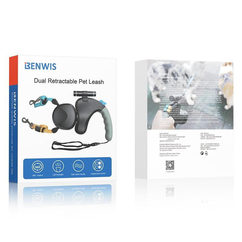 Benwis HA-DWL-2 Doppeltes einziehbares Zugseil für Haustiere/Hunde mit LED-Taschenlampe