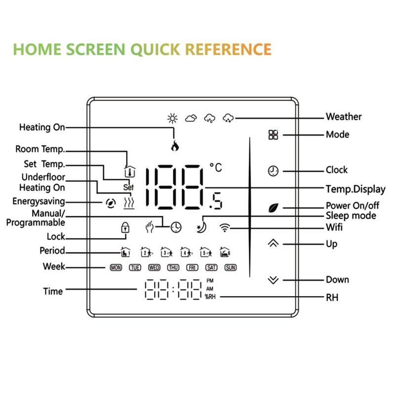 Dieser Thermostat verfügt über eine schlanke, rahmenlose Frontblende mit einem 3,0-Zoll-LCD-Display und einer 2,5D-abgerundeten Kante für ein edles, modernes Erscheinungsbild. Der mehrfarbige LED-Bildschirm ermöglicht es, Einstellungen und Rauminformationen auf einen Blick zu erfassen, während die verdeckten kapazitiven Touch-Tasten das minimalistische Design unterstreichen. Er fügt sich nahtlos in die Wand ein und passt sowohl zu modernen als auch zu klassischen Einrichtungsstilen.