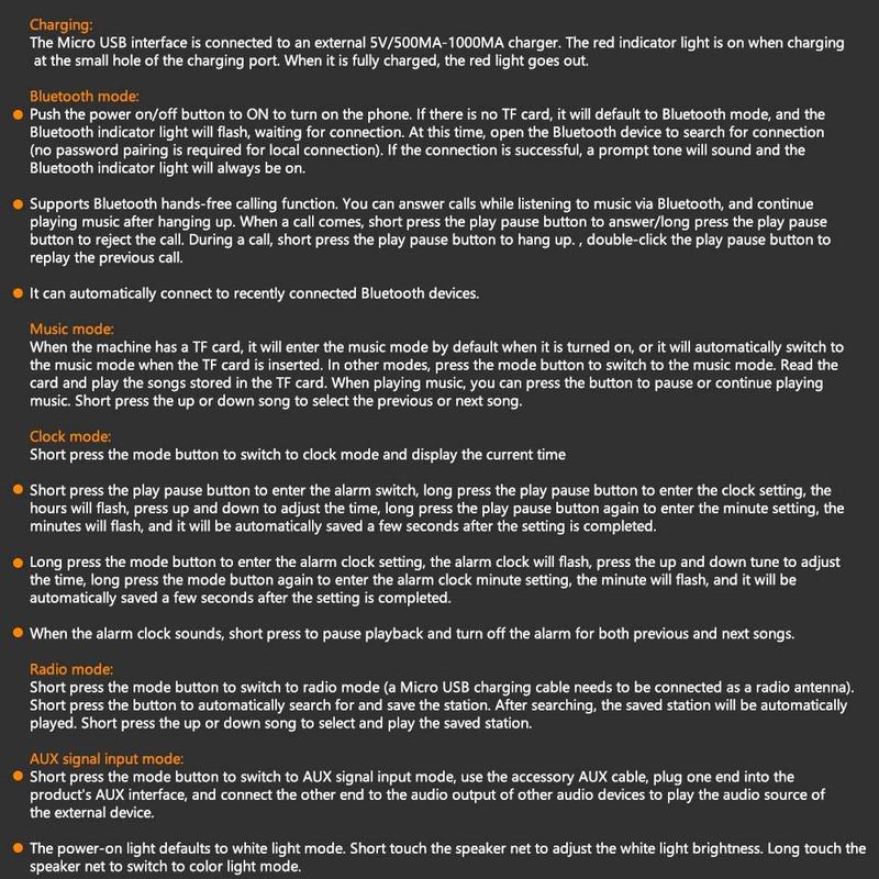 Merkmale: Uhr, Wecker, Bluetooth-Wireless-Audio, TF-Karte, U-Disk-Wiedergabe, Unterstützung kabelgebundenen Audio-Eingang, kann an den Fernseher, Computer, Tablet, Handy und andere Audioquellen angeschlossen werden