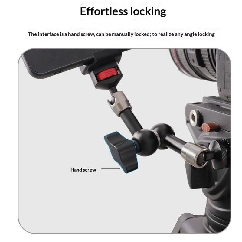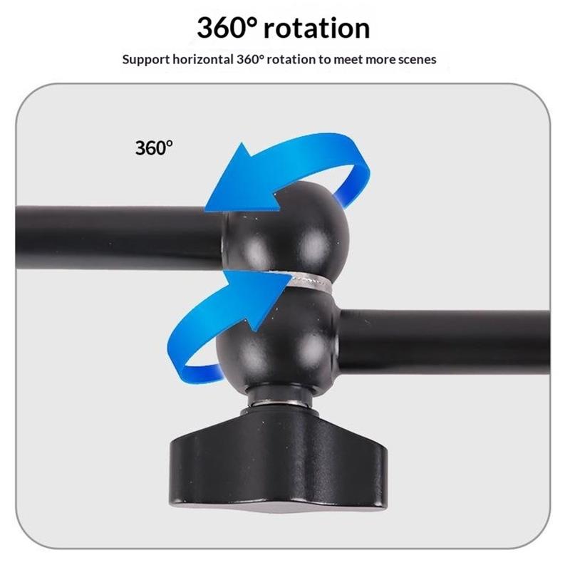 Das Design mit zwei Kugelgelenken ermöglicht eine 360°-Verstellung für eine präzisere Positionierung, während das standardmäßige 1/4"-Gewinde an beiden Enden die Kompatibilität mit einer Vielzahl von Geräten gewährleistet. Der aus einer Aluminiumlegierung gefertigte Arm bietet eine solide und langlebige Konstruktion und ist gleichzeitig leicht genug für den einfachen Transport und den täglichen Gebrauch.