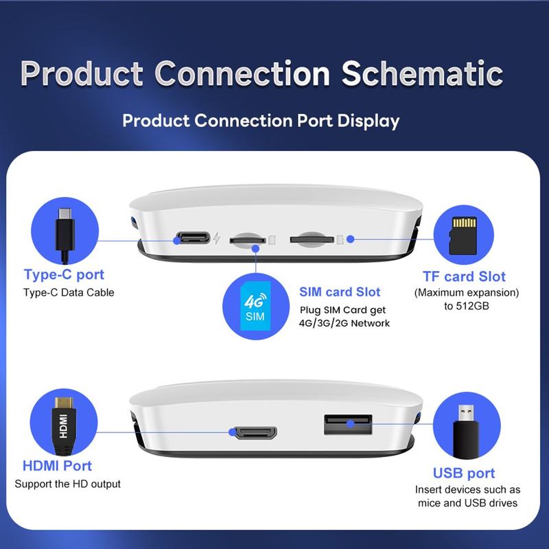 Anschlüsse: LED-Anzeige, Typ-C-Buchsenanschluss, TF-Kartenhalter, USB-Buchsenanschluss, SIM-Kartenhalter, HDMI-Schnittstelle