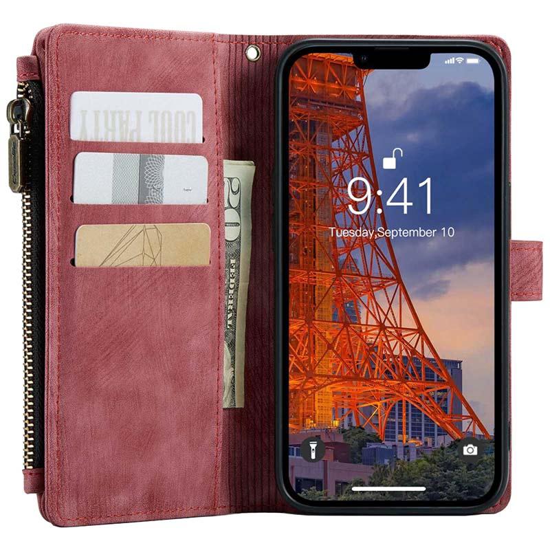 Diese multifunktionale Brieftaschenhülle für das iPhone 14 Plus wird Sie sprachlos machen! Entworfen mit zehn Kartenfächern, einem Geldfach und einer Reißverschlusstasche - genug, um Ihre wichtigsten Dinge überall hin mitzunehmen! Es besteht aus einem hochwertigen Polyurethan und einem inneren TPU-Material, das mit einem Magnetverschluss gesichert ist. Außerdem wird es mit einer Handschlaufe für müheloseres Tragen geliefert und kann als Ständer verwendet werden, um Videos freihändig anzusehen.