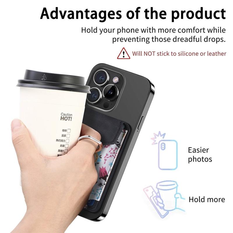 Dieser Kartenhalter ist ideal für Benutzer, die praktisch sein wollen, ohne auf Stil zu verzichten. Er bewahrt Ihre Karten sicher auf, verbessert die Handhabung des Telefons mit dem Ringhalter und bietet dank der Kickstand-Funktion zusätzlichen Komfort beim Freisprechen. Die starke Magnetbefestigung sorgt für Sicherheit im täglichen Gebrauch, auch unterwegs.
