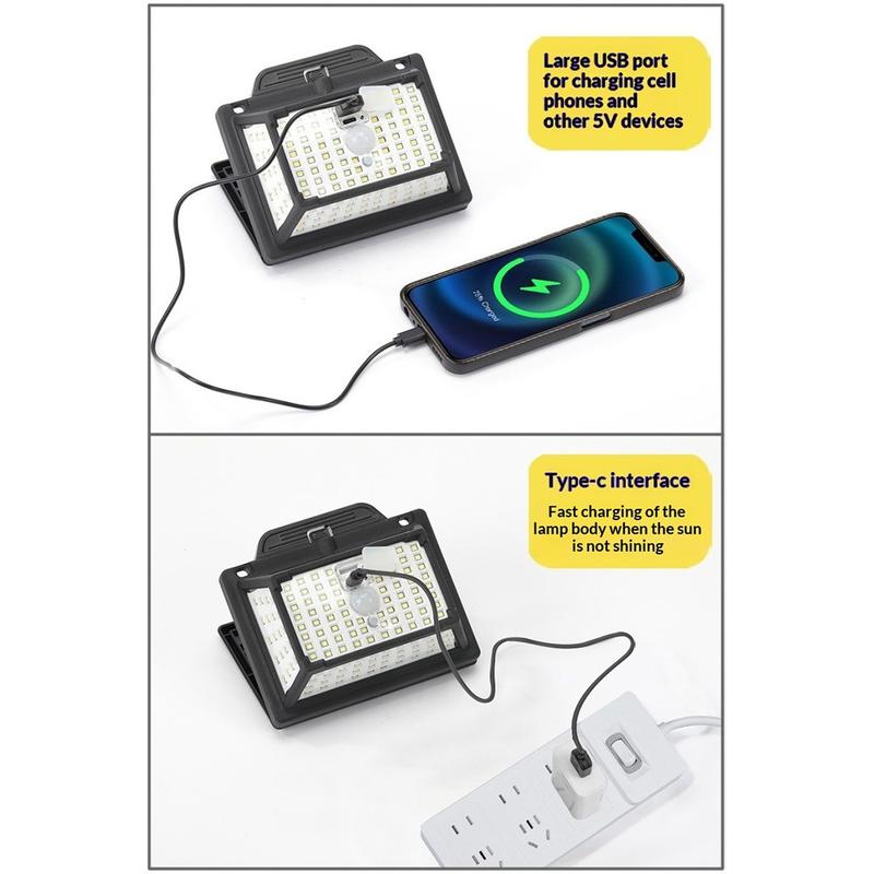 • CCP087 190-LED-Solar-Bewegungsmelder - wasserdichte IP65-Außen-Gartenlampe mit Solarpanel und Typ-C-Ladeanschluss