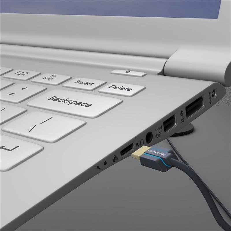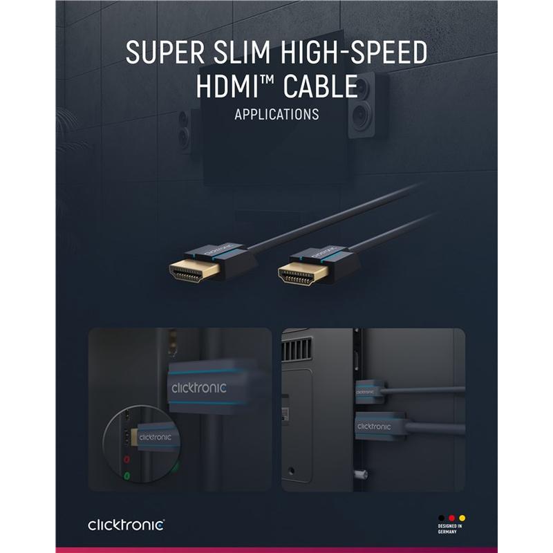 Den ultrasmala HDMI™-höghastighetskabeln ansluter TV-apparater och monitorer till t.ex. bärbara datorer, projektorer, beamers eller spelkonsoler som PlayStation eller Xbox för felfria film- och spelupplevelser. UHD-signalöverföring med upp till 4K @ 60 Hz (2160p) och Full HD @ 60 Hz (1080p), Extra smal HDMI™-anslutningskabel för hög flexibilitet vid anslutning och med maximal överföringshastighet på upp till 18 Gbit/s, 24 karat guldpläterade HDMI™-kontakter och avancerad teknik garanterar felfri signalkvalitet utan bildöverföringsfördröjningar för en optimal spelupplevelse. Rena kopparledare och 3-faldig avskärmning för klart ljud och knivskarp video- och bildkvalitet, Clicktronic 4K-kabel med HDMI™ Premium-certifiering garanterar bästa kvalitet. HDMI™-anslutning för alla vanliga funktioner som ARC (audio return channel), HDCP eller 3D-innehåll