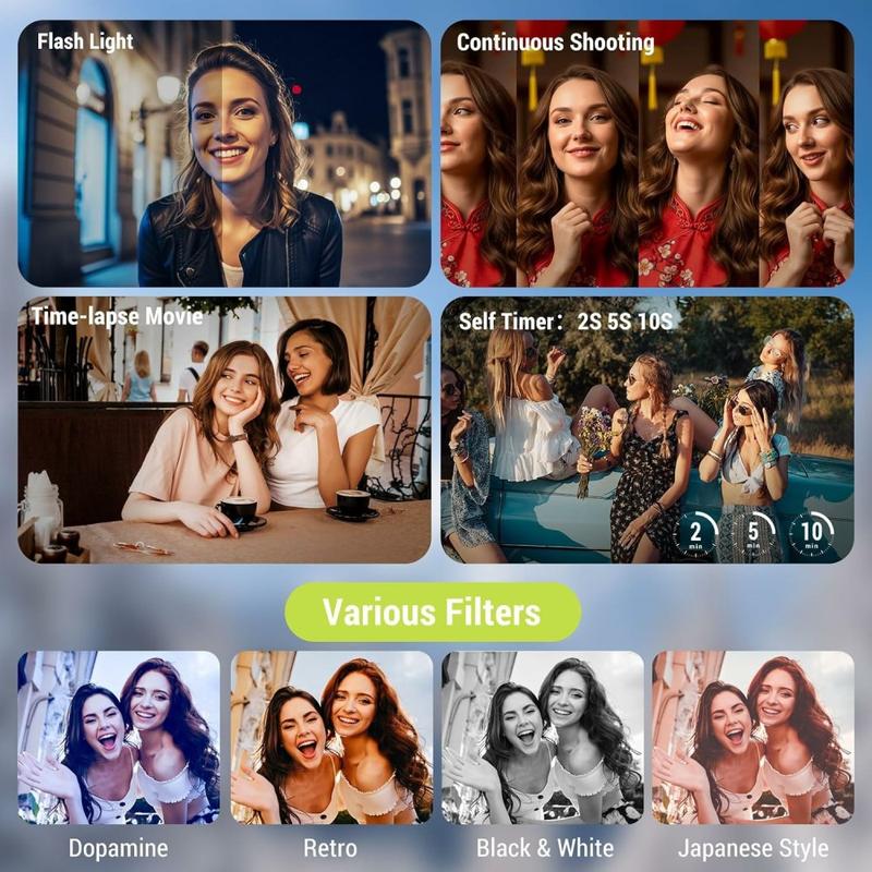 Die CV21 4K-Digitalkamera wurde für Content Creators, Vlogger und alltägliche Nutzer entwickelt, die hochwertige Videos und Fotos in einem kompakten Format wünschen. Ausgestattet mit einem Sony 230D-Sensor nimmt sie detailreiche Bilder und ruckelfreie 4K-Videos auf, während das um 270° drehbare Display das Einrahmen mühelos ermöglicht. Mit leistungsstarkem Digitalzoom, kreativen Filtern und mehreren Aufnahmemodi ist diese Kamera ein vielseitiger Begleiter für Vlogging, Reisen und tägliche Aufnahmen.