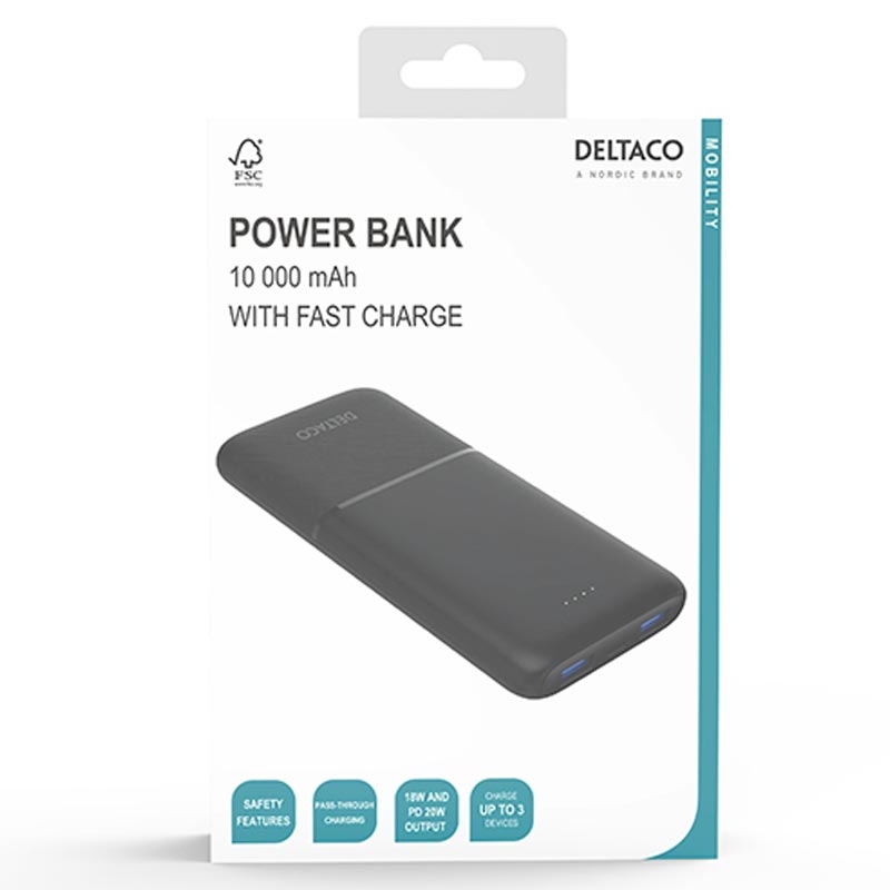 • Deltaco 10000mAh Powerbank - tragbares Ladegerät mit 20-W-USB-C-PD- und zwei 18-W-USB-A-Schnellladeanschlüssen