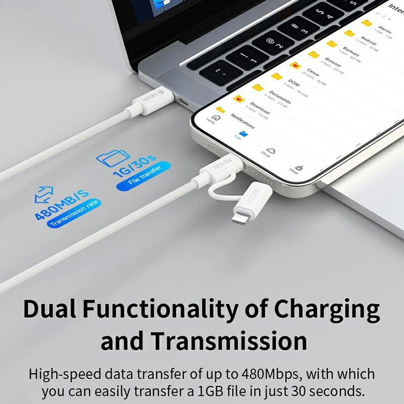 Entdecken Sie die Ein-Kabel-Lösung für moderne Geräte: Das 2-in-1-Kabel der Devia EC404 Smart Series kombiniert USB-C-zu-USB-C-Stromversorgung (bis zu 60 W) und eine Lightning/IP-Ladeoption (bis zu 27 W) in einem einzigen, übersichtlichen Kabel. Egal, ob Sie Ihren Laptop am Schreibtisch aufladen, Ihr Smartphone auf dem Sofa aufladen oder leichtes Gepäck für die Reise packen möchten, dieses Kabel sorgt für eine einfache Einrichtung - ohne Einbußen bei Geschwindigkeit, Stabilität oder Haltbarkeit. Der verbesserte TPE-Mantel ist flexibel, verwicklungsfrei und für den täglichen Gebrauch ausgelegt, während der dicke 20-AWG-Kern aus verzinntem Kupfer dazu beiträgt, Energieverluste zu reduzieren und so ein effizientes, kühleres Schnellladen zu ermöglichen.