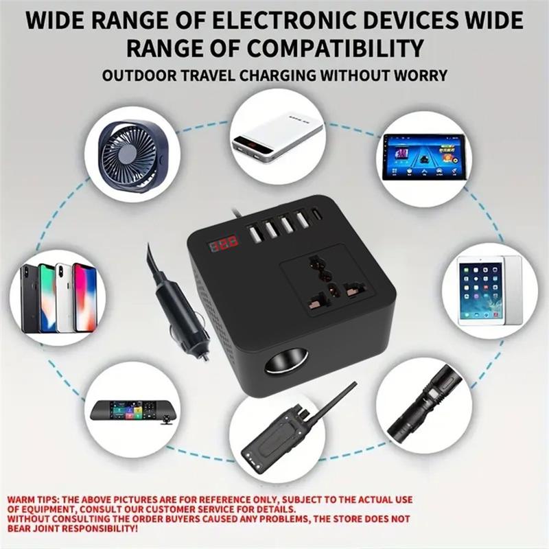 Versorgen Sie Ihre Geräte unterwegs mit Strom - mit dem Digital Display Car Power Inverter, einem kompakten und dennoch leistungsstarken Konverter, der den 12-V- oder 24-V-Gleichstrom Ihres Fahrzeugs in 110-V- oder 220-V-Wechselstrom umwandelt. Er ist mit mehreren Schnellladeanschlüssen, intelligenter Kühlung und vollem Sicherheitsschutz ausgestattet und eignet sich perfekt für Reisen, Camping und den Einsatz in Notfällen.