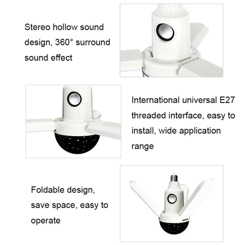 Die Bluetooth RGB Star Projector Deckenleuchte vereint Musik, farbenfrohe Projektion und weitwinklige Beleuchtung in einem kompakten und faltbaren Design. Mit dem integrierten Bluetooth-Lautsprecher können Sie Ihre Lieblingssongs genießen, während die farbenfrohen RGB-Lichter und Sternenmuster eine stimmungsvolle Atmosphäre für Partys, zum Entspannen oder als tägliche Stimmungsbeleuchtung schaffen. Die faltbare, dreiblättrige Struktur gewährleistet eine optimale Lichtabdeckung, während die mitgelieferte Fernbedienung eine mühelose Anpassung von Helligkeit, Farbtemperatur und Ton ermöglicht.