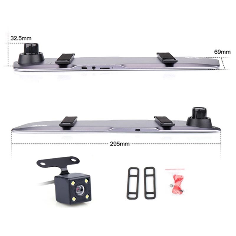 Die vordere Dashcam verfügt über ein spiegelmontiertes Design, ein 170-Grad-Ultraweitwinkelobjektiv, ein 4,39-Zoll-Display und zeichnet Videos in 1080p Full HD-Auflösung auf. Die Rückfahrkamera verfügt über ein 110-Grad-Weitwinkelobjektiv und zeichnet Videos in 720p-HD-Auflösung auf. Diese Spiegel-Autokamera mit zwei Objektiven ist mit einem Nachtsichtgerät und einem G-Sensor ausgestattet.