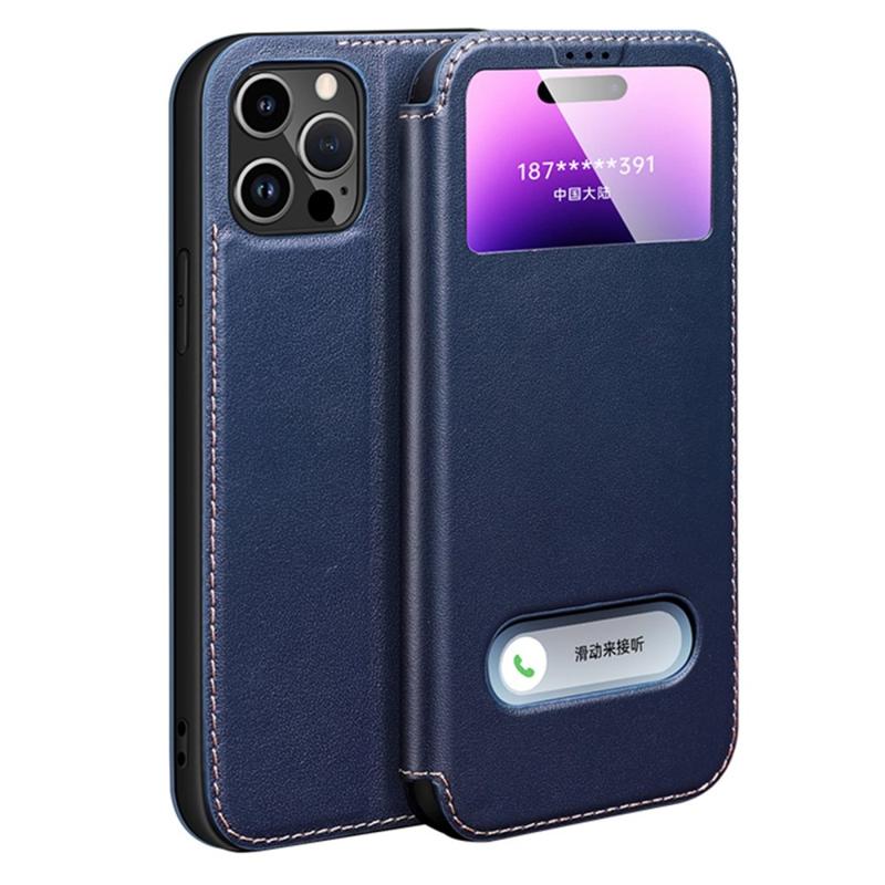 Genuine Cowhide Leather Case for iPhone 14 Pro Max Shockproof Cover Dual Window Anti-Drop Phone Case with Stand