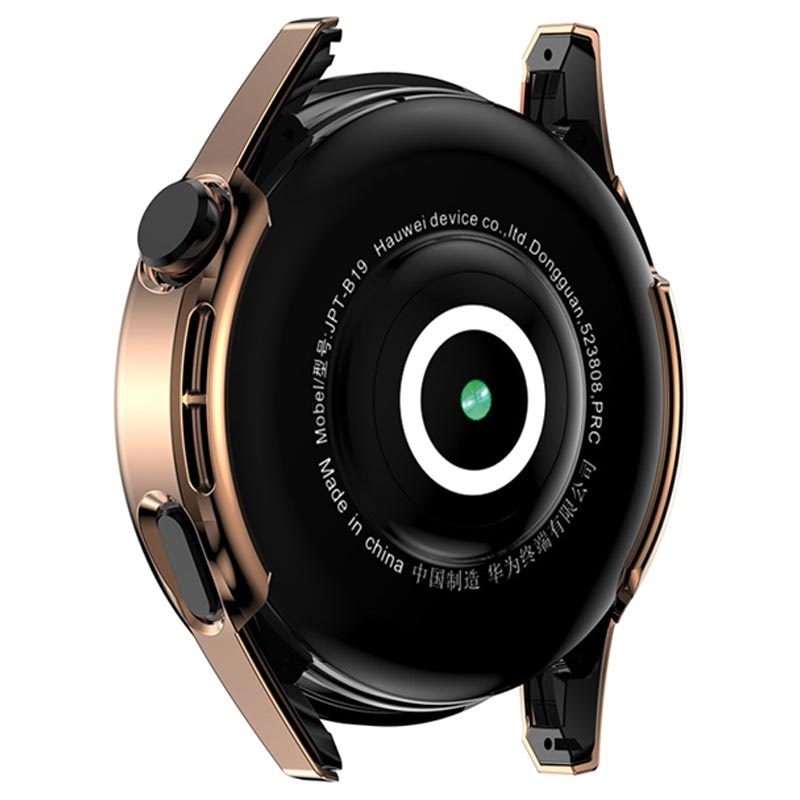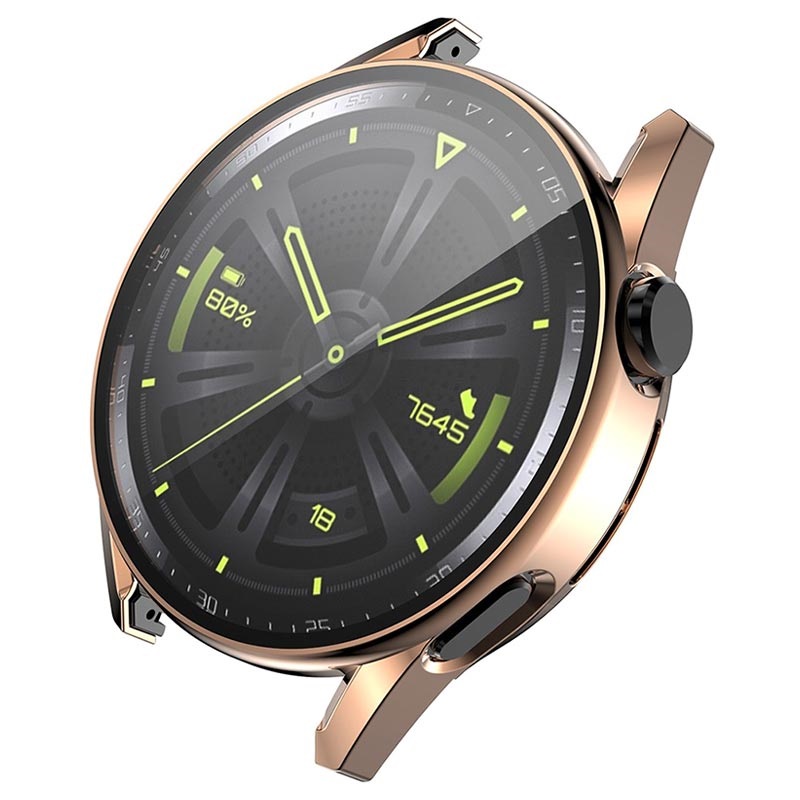 Das 2-in-1-Design besteht aus einem hochwertigen Polycarbonat-Gehäuse und einem integrierten 9H-Bildschirmschutz, der Schutz vor Staub, Schmutz, Beschädigungen und Kratzern bietet. Es ist schlank und leicht, so dass es kaum ins Gewicht fällt, während der galvanisierte Rahmen wie Metall glänzt. Gehärtetes Glas beeinträchtigt die Empfindlichkeit des Bildschirms nicht, und ein präzise geformtes Gehäuse mit Aussparungen bewahrt die Funktionalität der Huawei Watch GT 3.