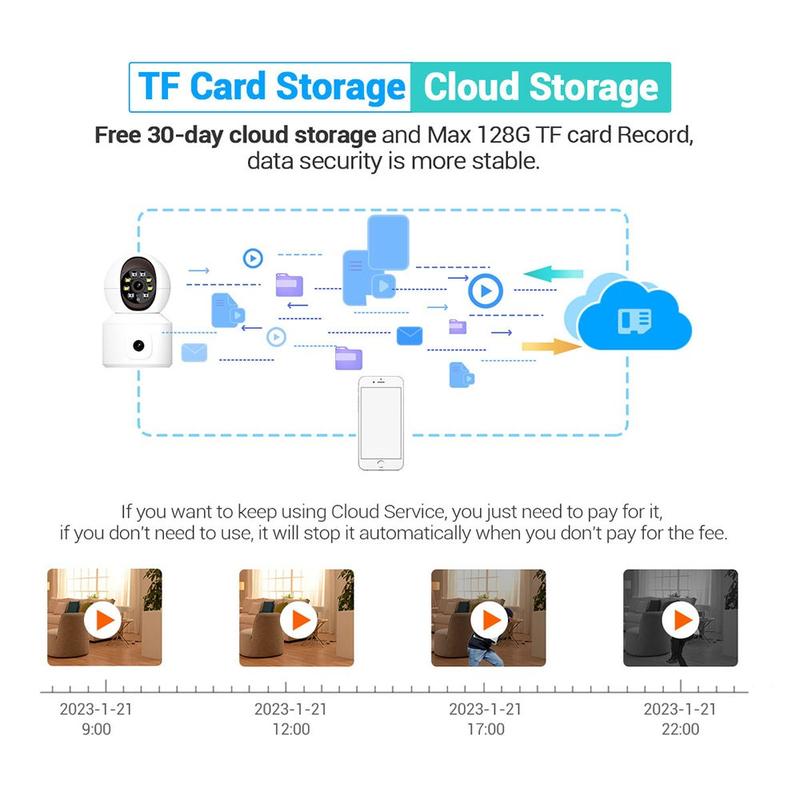 Unterstützt bis zu 128 GB TF-Karte und Cloud-Speicher (30 Tage kostenloser Cloud-Speicher)