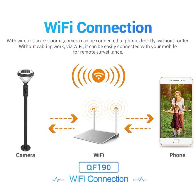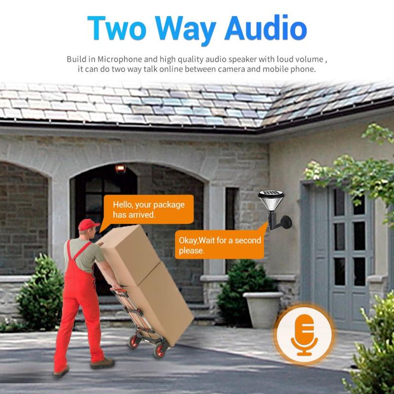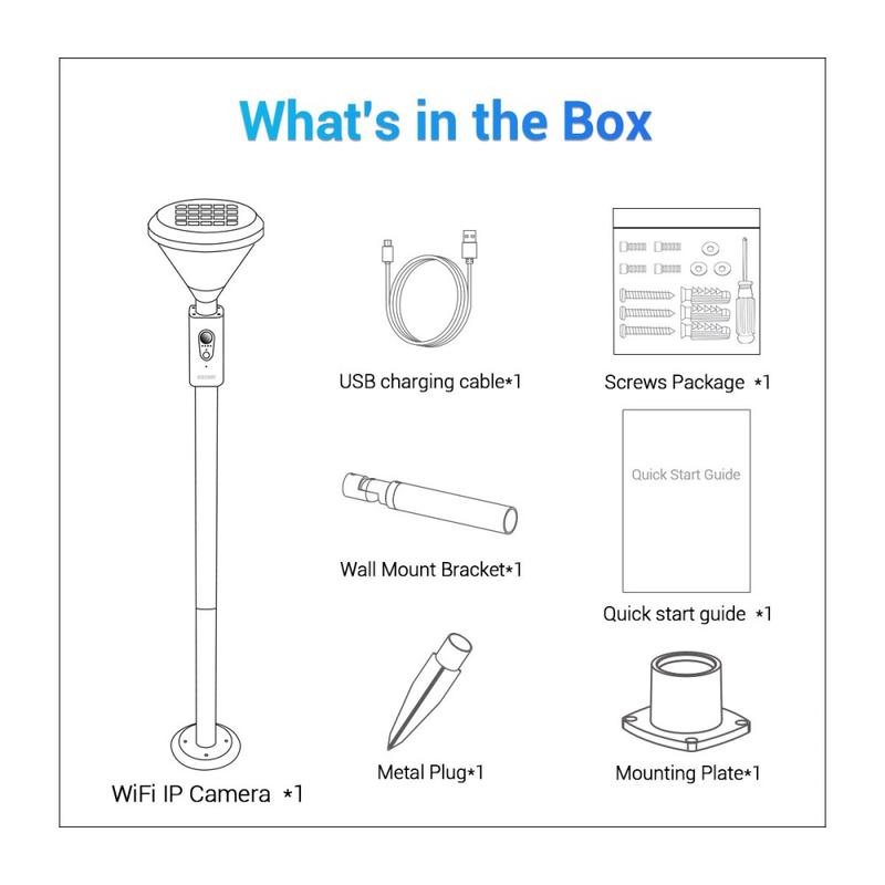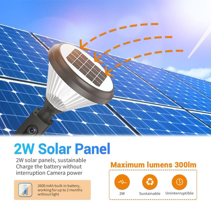 - Solarenergie und zwei Batterien - Ein 2-Watt-Panel speist die 2000-mAh-Lampe und die 2600-mAh-Kamerazelle; mit nur 3-6 Stunden Sonnenlicht kann das Gerät wochenlang betrieben werden.