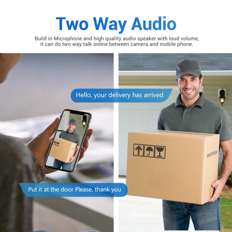 - Zwei-Wege-Sprachübertragung: Über das integrierte Mikrofon und den Lautsprecher können Sie mit Besuchern sprechen oder Eindringlinge abschrecken.