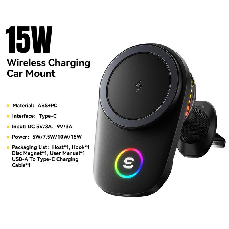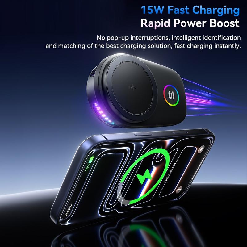 Mit dem magnetischen kabellosen Autoladegerät ESSAGER 15W bleibt Ihr Smartphone aufgeladen, gut sichtbar und sicher an seinem Platz. Diese Halterung für die Lüftungsdüse wurde für Fahrer entwickelt, die sich eine übersichtlichere und bequemere Lösung wünschen, und vereint schnelles kabelloses Laden, starken Magnethalt und aktive Kühlung in einem kompakten Zubehörteil. Die integrierte RGB-Beleuchtung sorgt für einen modernen Touch, während die 90-Grad-Drehung den einfachen Wechsel zwischen Hoch- und Querformat für Navigation, Anrufe oder die Musiksteuerung ermöglicht.
