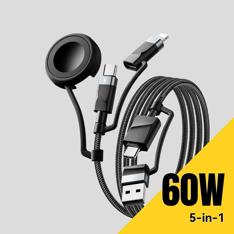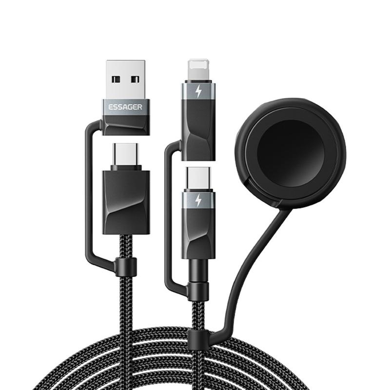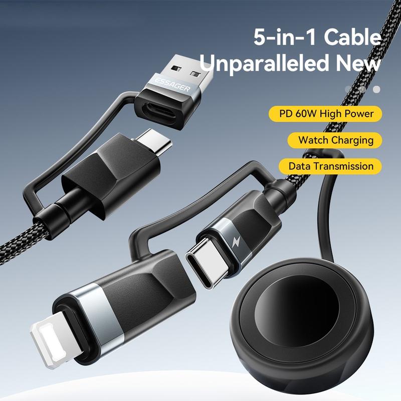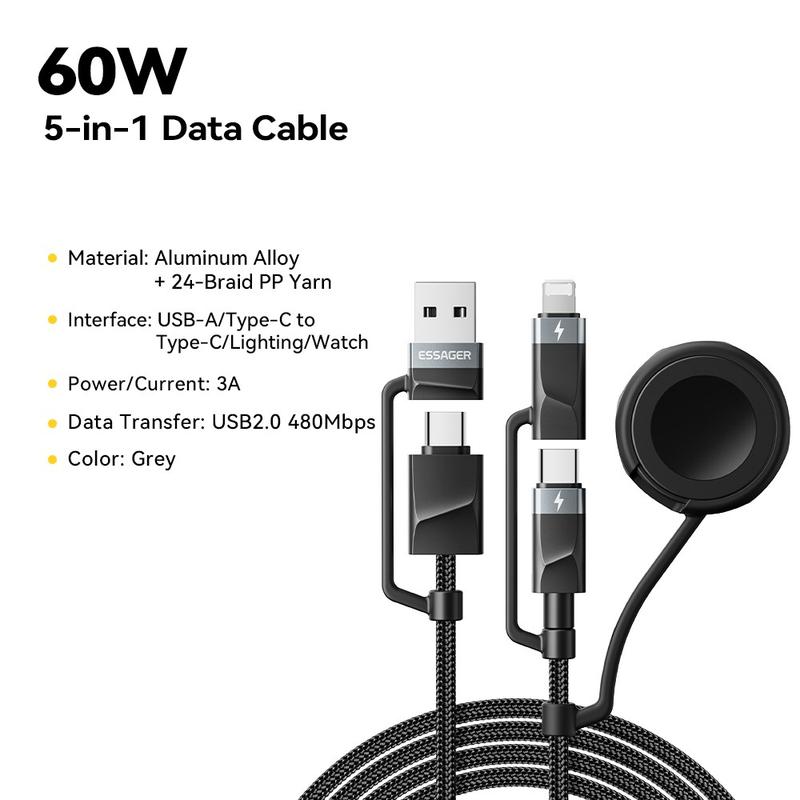 • Essager 5-in-1-Schnellladekabel 1m - PD 60 W Multi-Ladekabel mit USB-C-, Lightning-, USB-A- und Apple Watch-Anschluss, 480 Mbit/s Datensynchronisation