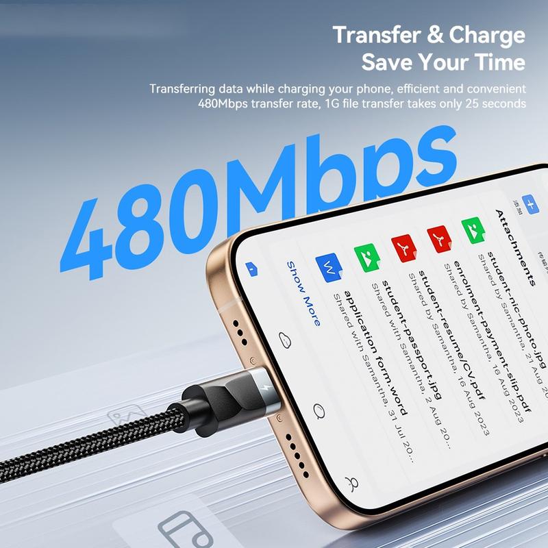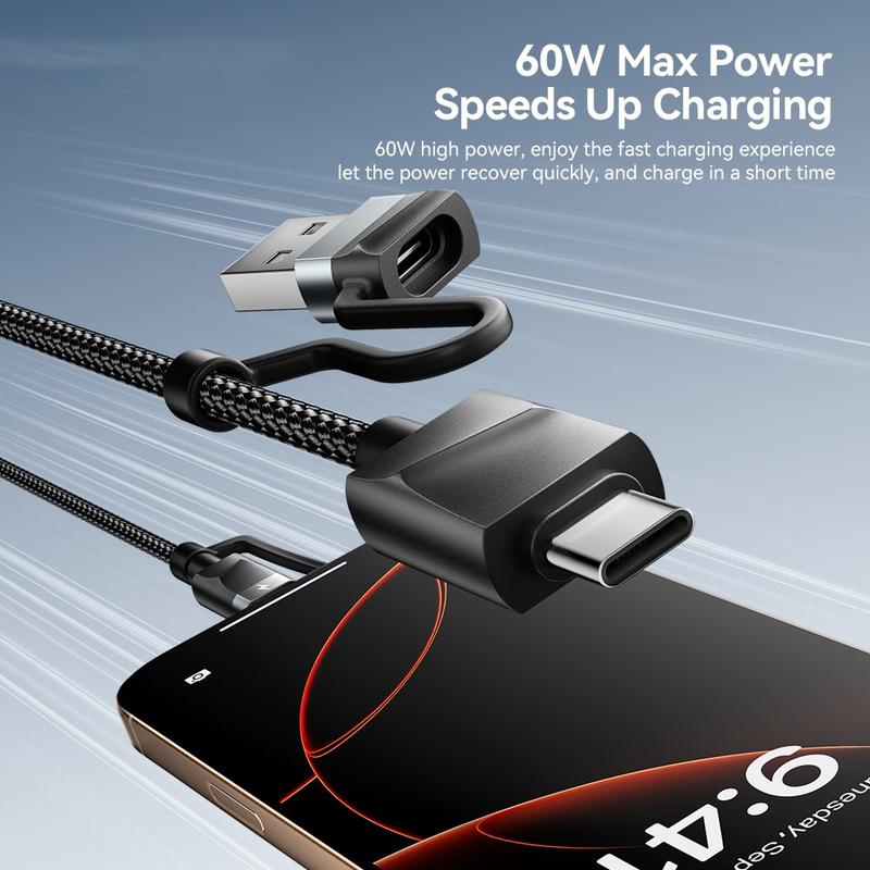 Es unterstützt eine Ladeleistung von bis zu 60 W und kann kompatible USB-C-Geräte schnell mit Strom versorgen, während es gleichzeitig zuverlässiges Laden für andere unterstützte Geräte bietet. Die robusten Anschlüsse aus Aluminiumlegierung und die verstärkte geflochtene Konstruktion des Kabels verbessern die Flexibilität und Widerstandsfähigkeit gegenüber täglicher Abnutzung und machen es ideal für Reisen, das Büro und den täglichen Gebrauch. Ein integriertes Klettband sorgt dafür, dass das Kabel bei Nichtgebrauch ordentlich aufgeräumt bleibt.