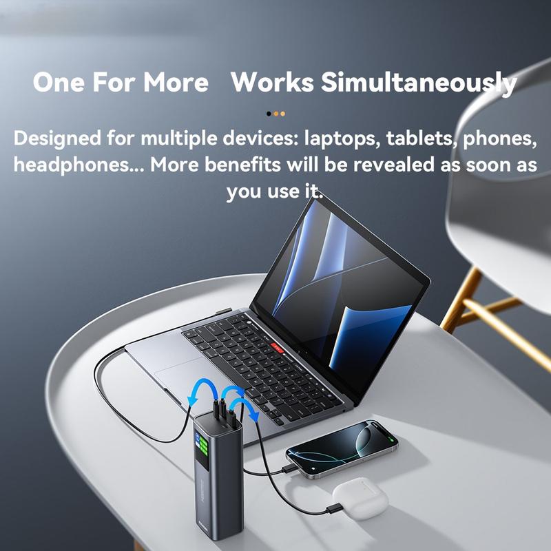Ausgestattet mit zwei Typ-C-Anschlüssen und einem USB-A-Anschluss, können Sie bis zu drei Geräte gleichzeitig aufladen. Versorgen Sie Ihren Laptop, Ihr Telefon und Ihre Ohrstöpsel mit Strom - alles mit einem kompakten Ladegerät.
