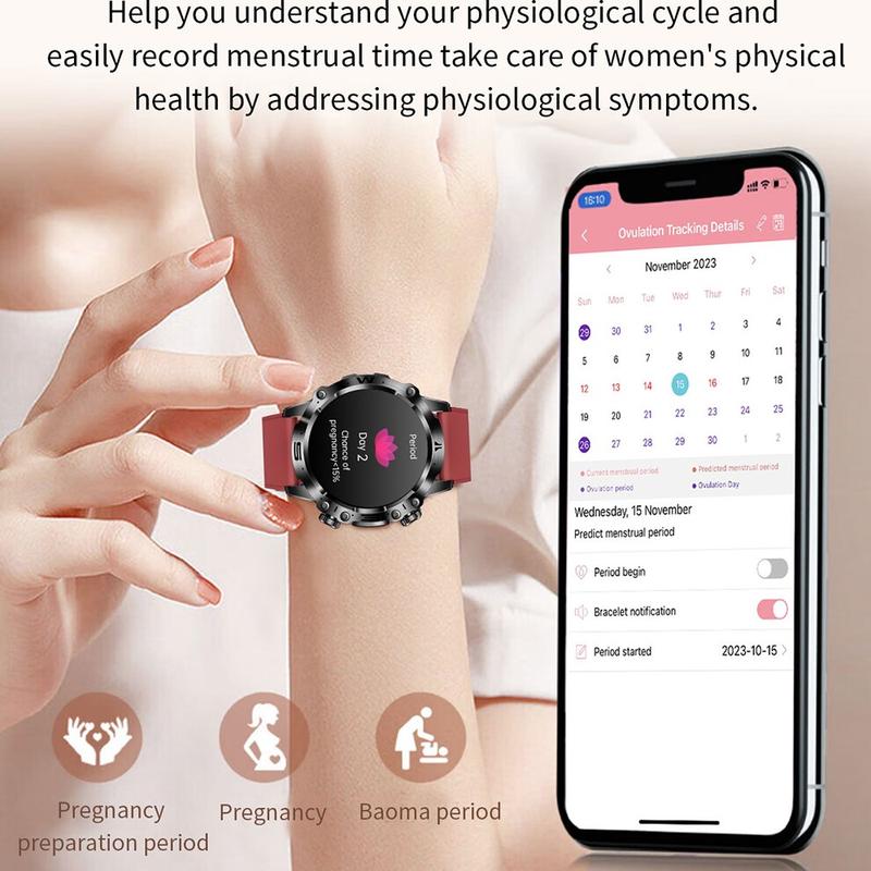 - Umfassende Gesundheitsüberwachung: Verfolgen Sie Ihre Gesundheit mit Funktionen wie EKG-Elektrokardiogramm, nicht-invasive Blutzuckermessung, Analyse der Blutzusammensetzung (Harnsäure- und Blutfettfunktionen), BMI-Körperfettmessung, HRV-Analyse, KI-Diagnostik, Menstruationsüberwachung, Herzfrequenzüberwachung, Schlafüberwachung und mehr.