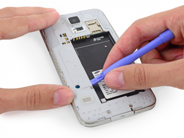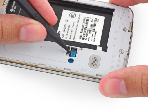 Da gibt es eine Aussparung in der unteren rechten Ecke des Akkus. Wieder einmal schieben Sie ein Kunststoff-Öffnungswerkzeug oder den Fingernagel in die Aussparung, und den Akku zu heben.