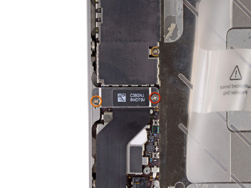 Entfernen Sie die folgenden Befestigungsschrauben, die die Abdeckung des Dockanschluss-Kabels mit der Logikplatine verbinden: