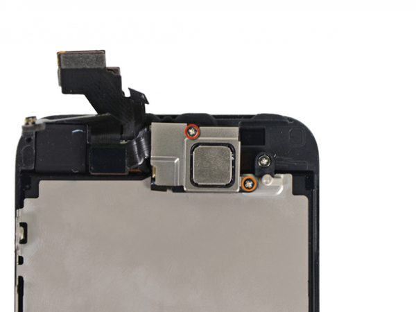 Legen Sie das Öffnungswerkzeg aus Kunststoff oder die Spitze eines Spudgers unter die Kontaktstelle des Hörmuschel-Lautsprechers, um das Vorderkamera-Kabel vom Display zu entfernen.