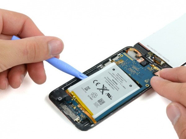 In den nächsten Schritten werden Sie den Klebstoff von der Unterseite der Batterie, der Hauptplatine und dem Rahmen unter der Batterie lösen. Tun Sie dies langsam, vorsichtig und gleichmäßig. Achten Sie darauf, die Batterie nicht durchzustechen oder die Hauptplatine zu biegen.