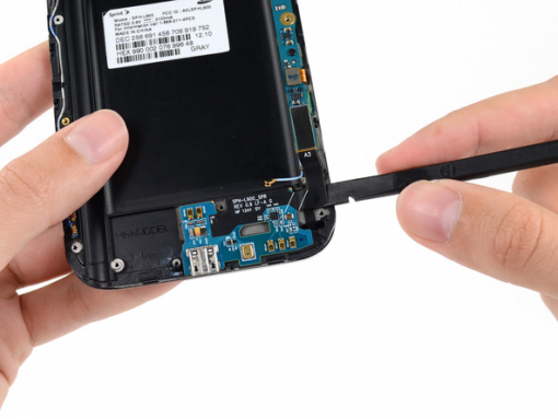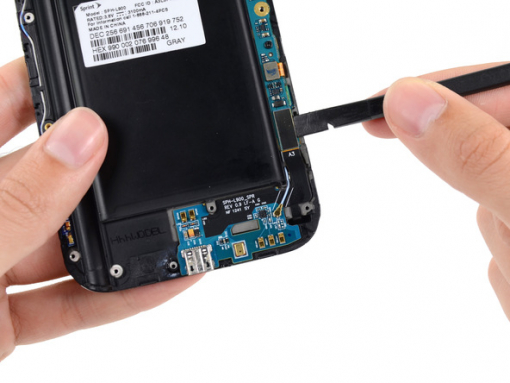 Verwenden Sie einen Kunststoff-Öffnungswerkzeug, um den Akku aus dem Gehäuse zu heben. Sie müssen das Werkzeug in die Vertiefung über dem Akkufach einlegen, um dies zu tun.