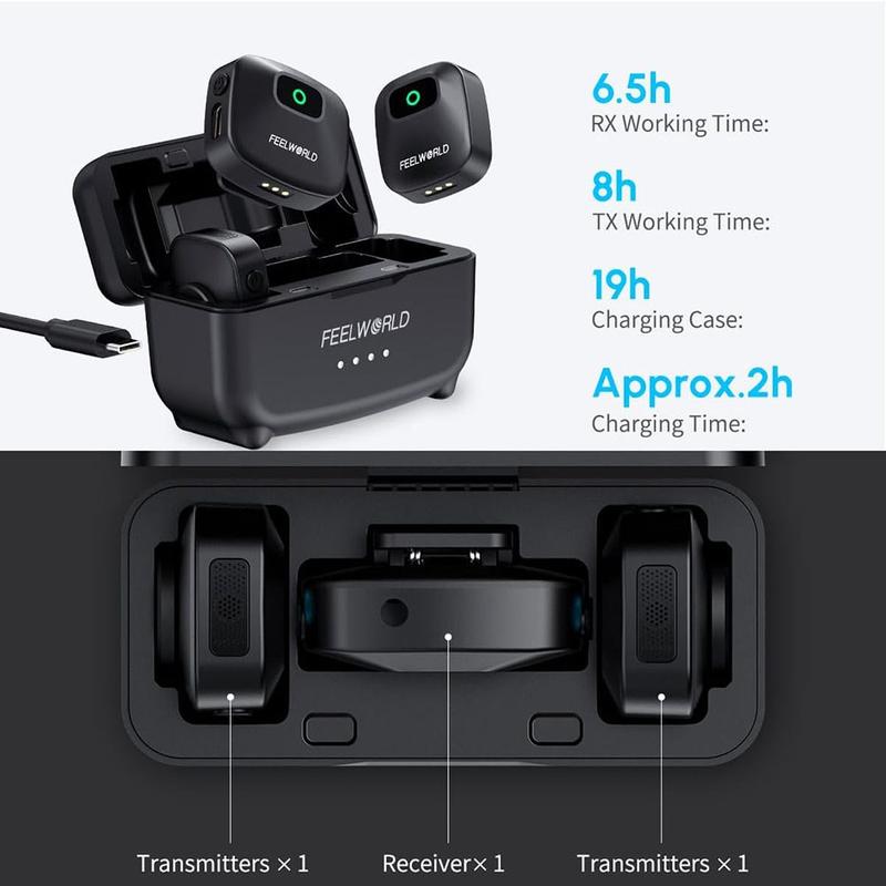 • Feelworld LM1 - Drahtloses Lavalier-Mikrofon mit 2 Sendern, 1 Empfänger und Ladekoffer für Smartphone, Kamera und PC