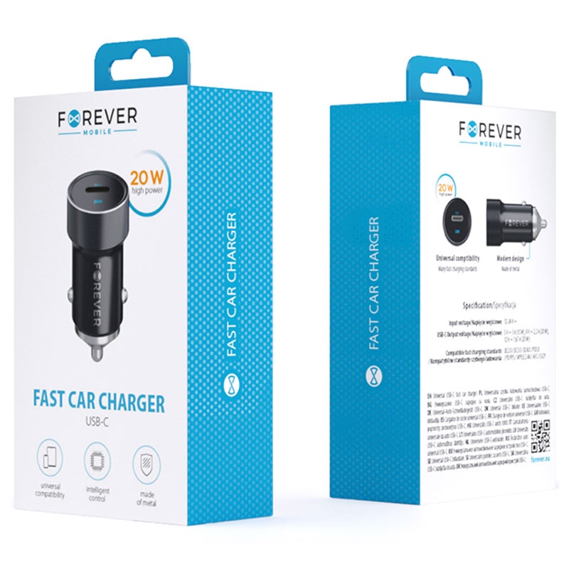 • Forever CC-06 Schnelles Autoladegerät - USB-C, 20W, PD3.0, QC 3.0, Apple 2.4A, Samsung AFC
